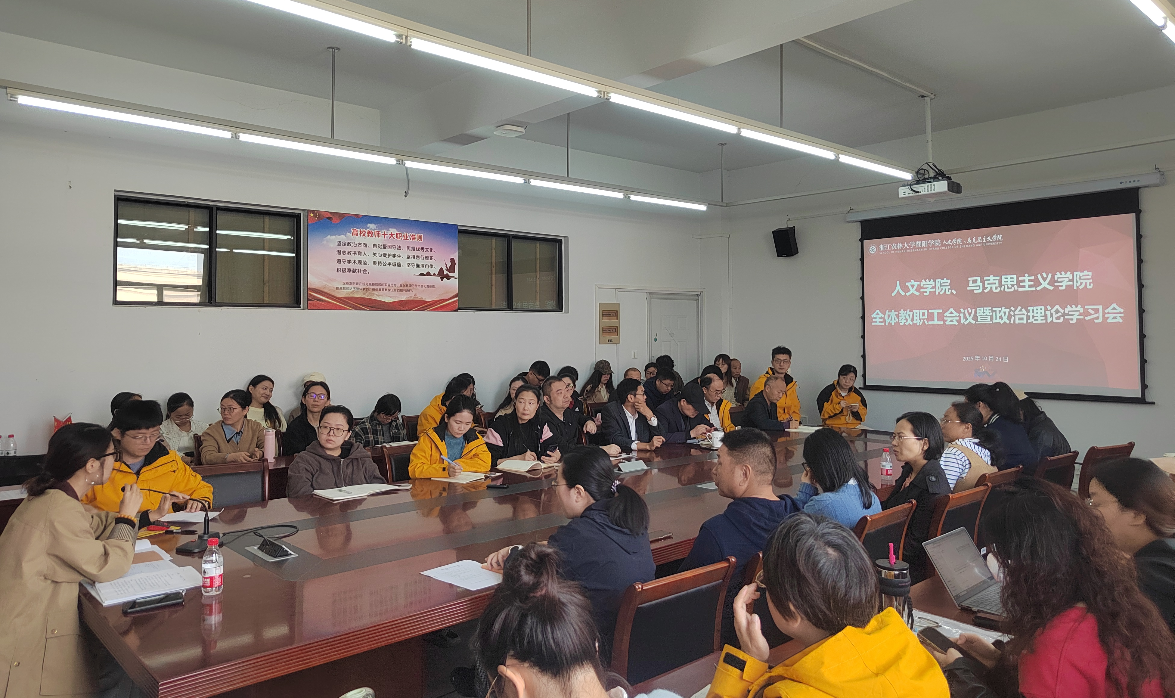 10月24日上午,人文学院、马克思主义学院在人文3502会议室召开2025年秋季学期全体教职工会议暨第九次政治理论学习会,进行师德师风专题学习。人文学院、马克思主义学院党总支书记周聪、党总支副书记石杭科及全体教职工参加会议。会议由石杭科主持。