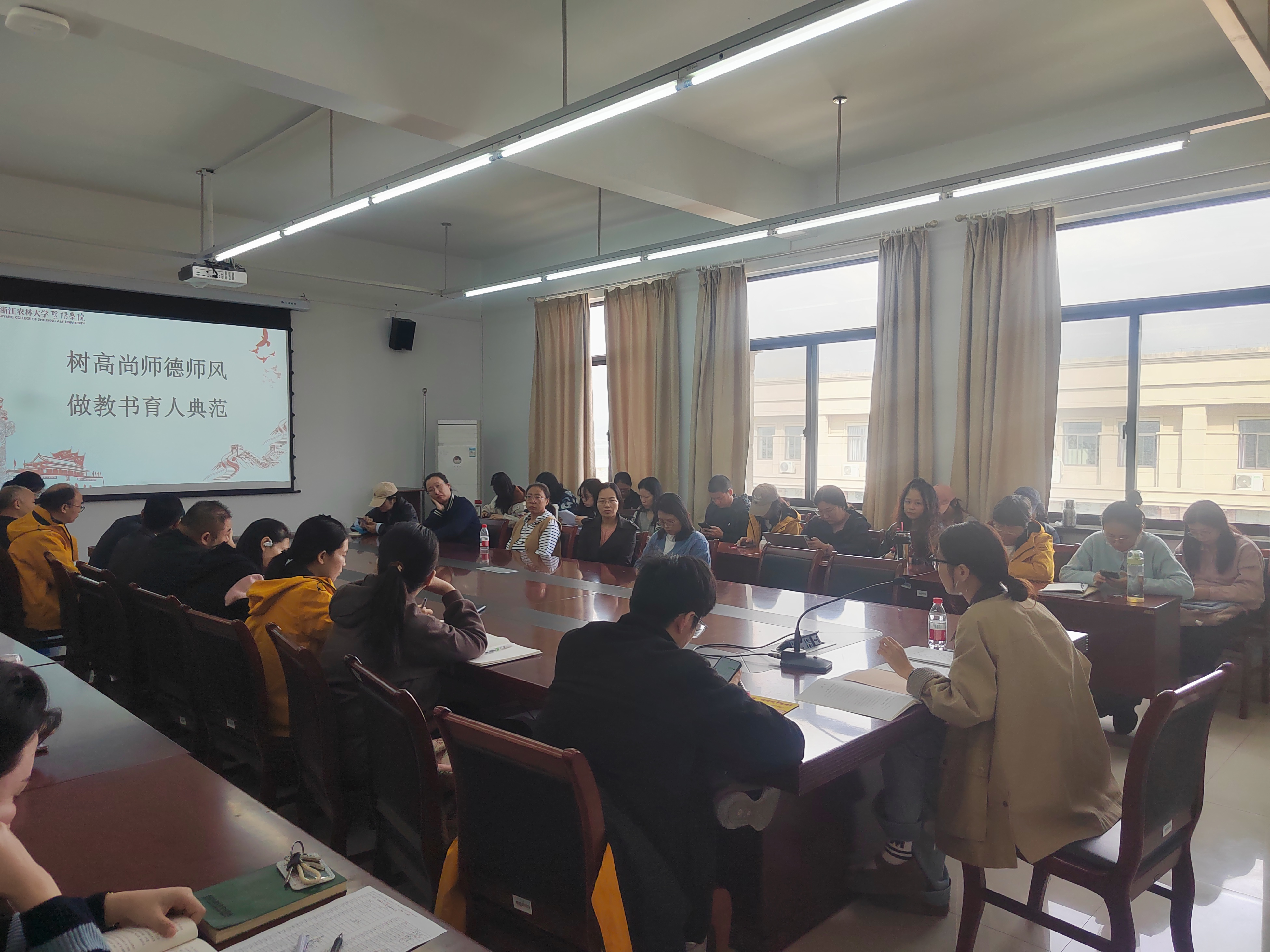 周聪以“树高尚师德师风,做教书育人典范”为主题,从传统师德、新时代师德师风、厚师德强师风促发展三方面进行了师德师风的专题学习,分享和剖析了几个典型案例,并提出三点要求:好学敬业,完善自我修养;为人师表,发挥引领作用;教学相长,实现共同发展。