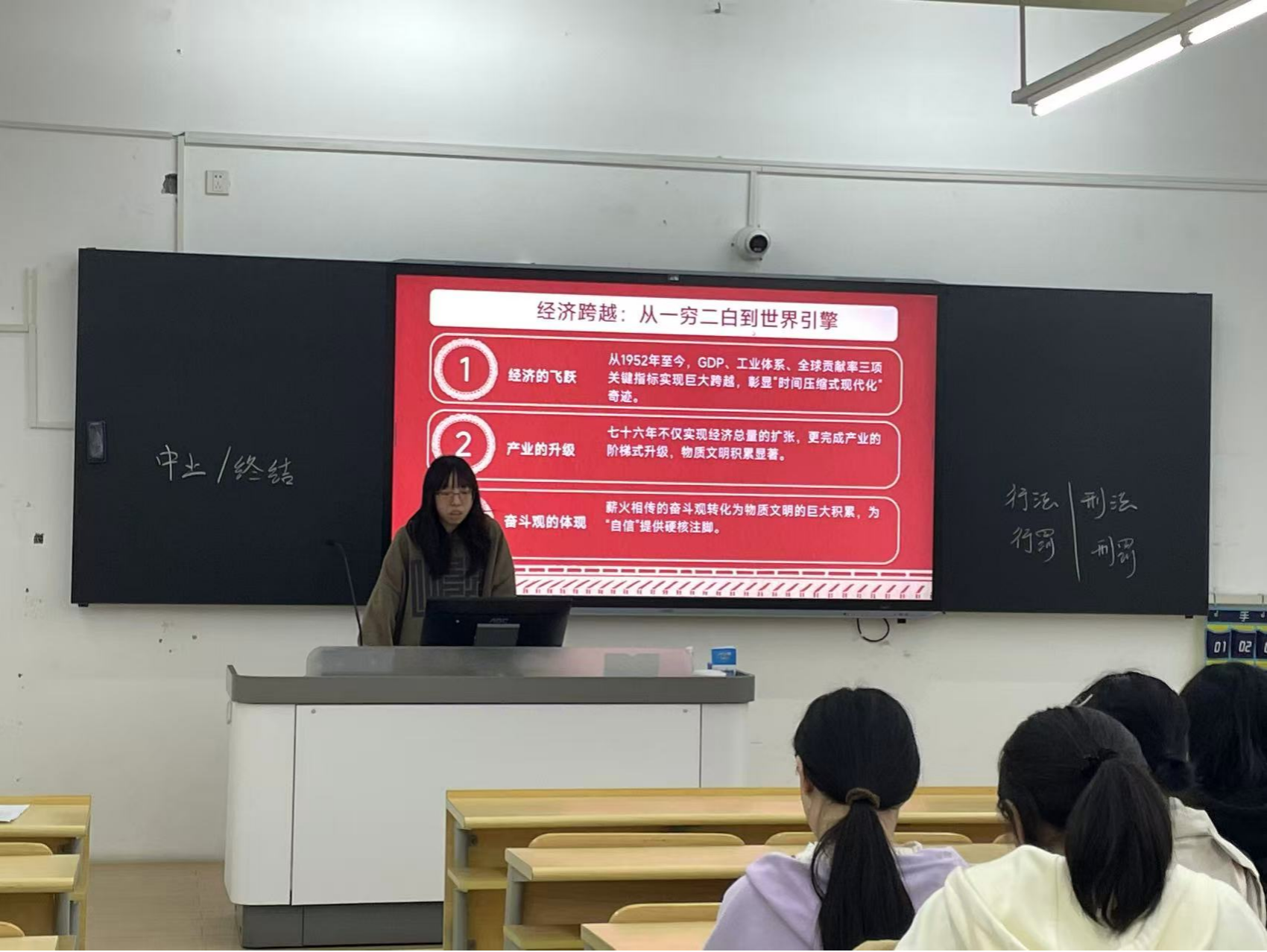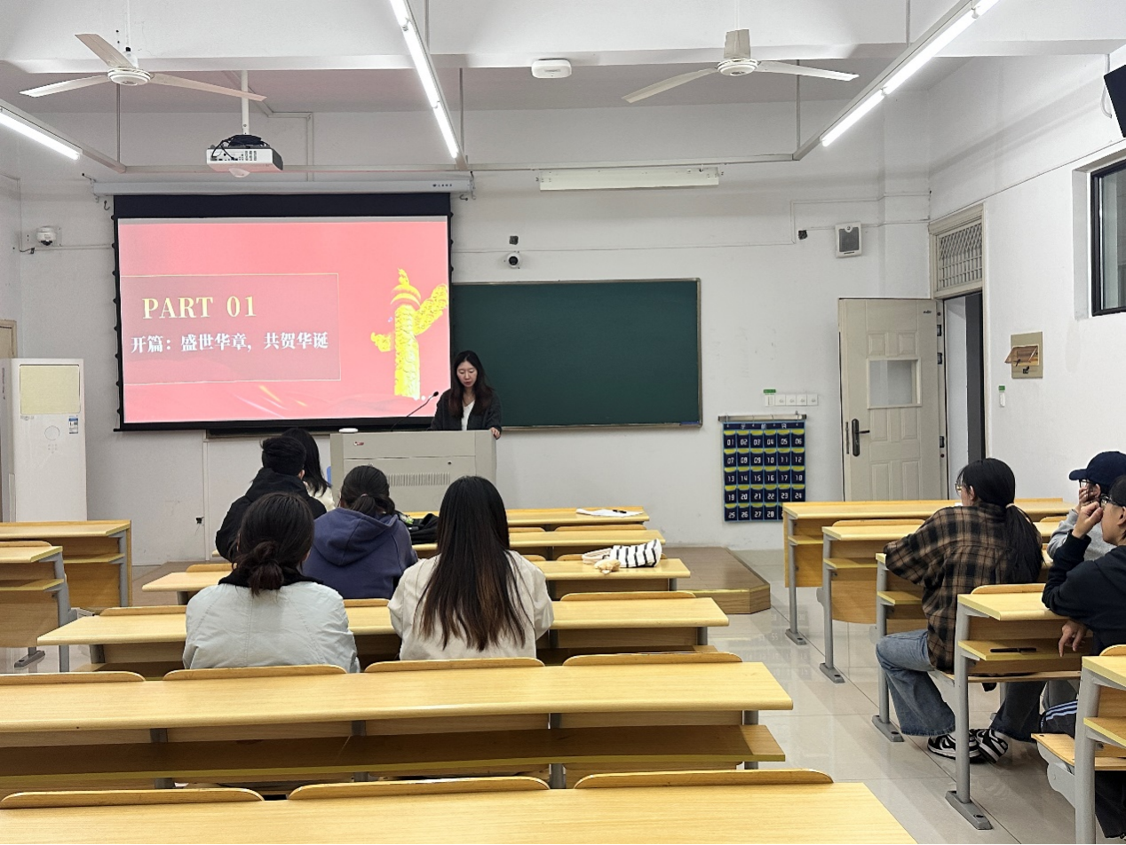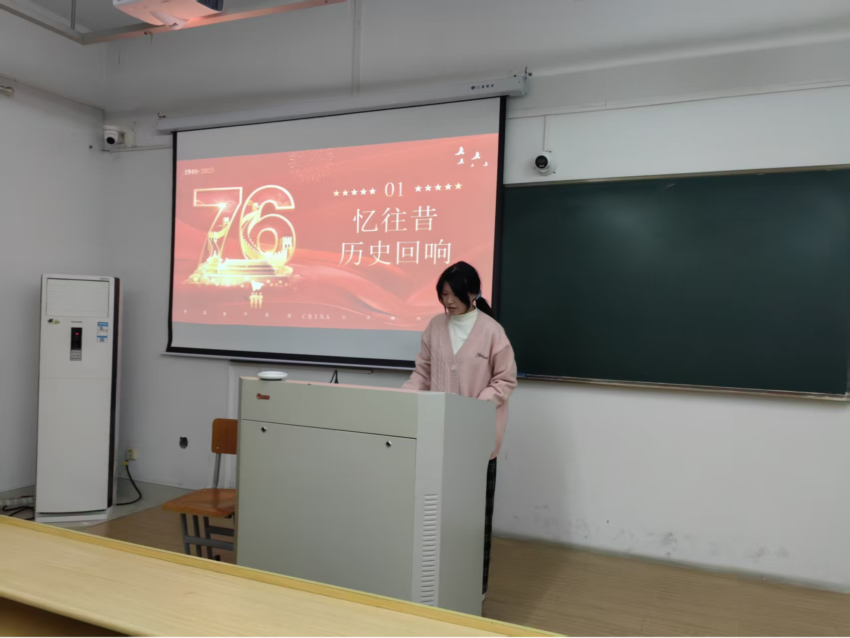 公共事业管理专业学生第二党支部主讲人仇梦瑶同志回顾1949年新中国成立至2025年的七十六载岁月,串联1921年中国共产党诞生到1949年新中国成立的关键节点,随后聚焦“奋斗答卷”,从三大维度呈现发展成就,随后解读红船精神、抗疫精神等构成的精神谱系,以及焦裕禄、钱学森、黄文秀等英雄人物的事迹,引导同学们思考精神传承。
