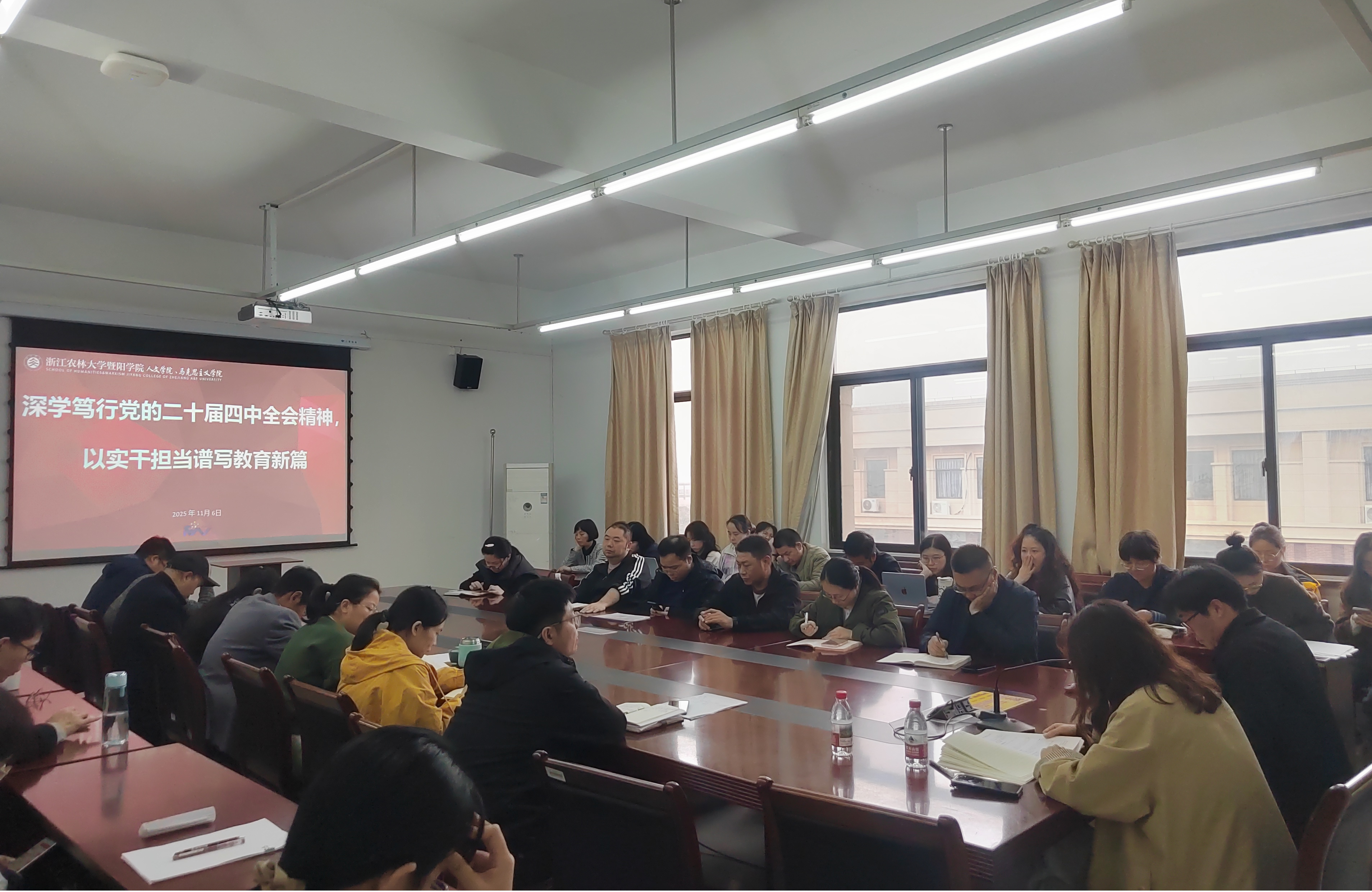 周聪领学党的二十届四中全会精神、《习近平谈治国理政》第五卷、习近平总书记关于巡视工作的重要论述精神和《浙江农林大学厉行节约反对浪费实施办法》等,就近期学生用电消防安全、意识形态、课堂管理等工作进行了布置和强调。她指出,全体教职工要把握相关会议和文件精神的要义,各支部也要通过“三会一课”、主题党日等形式深刻领会学习全会精神的核心要义,把握“十五五”教育的发展方向,将全会精神融入课堂。要推进教学科研的发展和创新,对接社会发展和产业的需求,更新教学内容,创新教学方法,与时俱进。全体教职工要深学细悟,将理论转化为育人的实效。