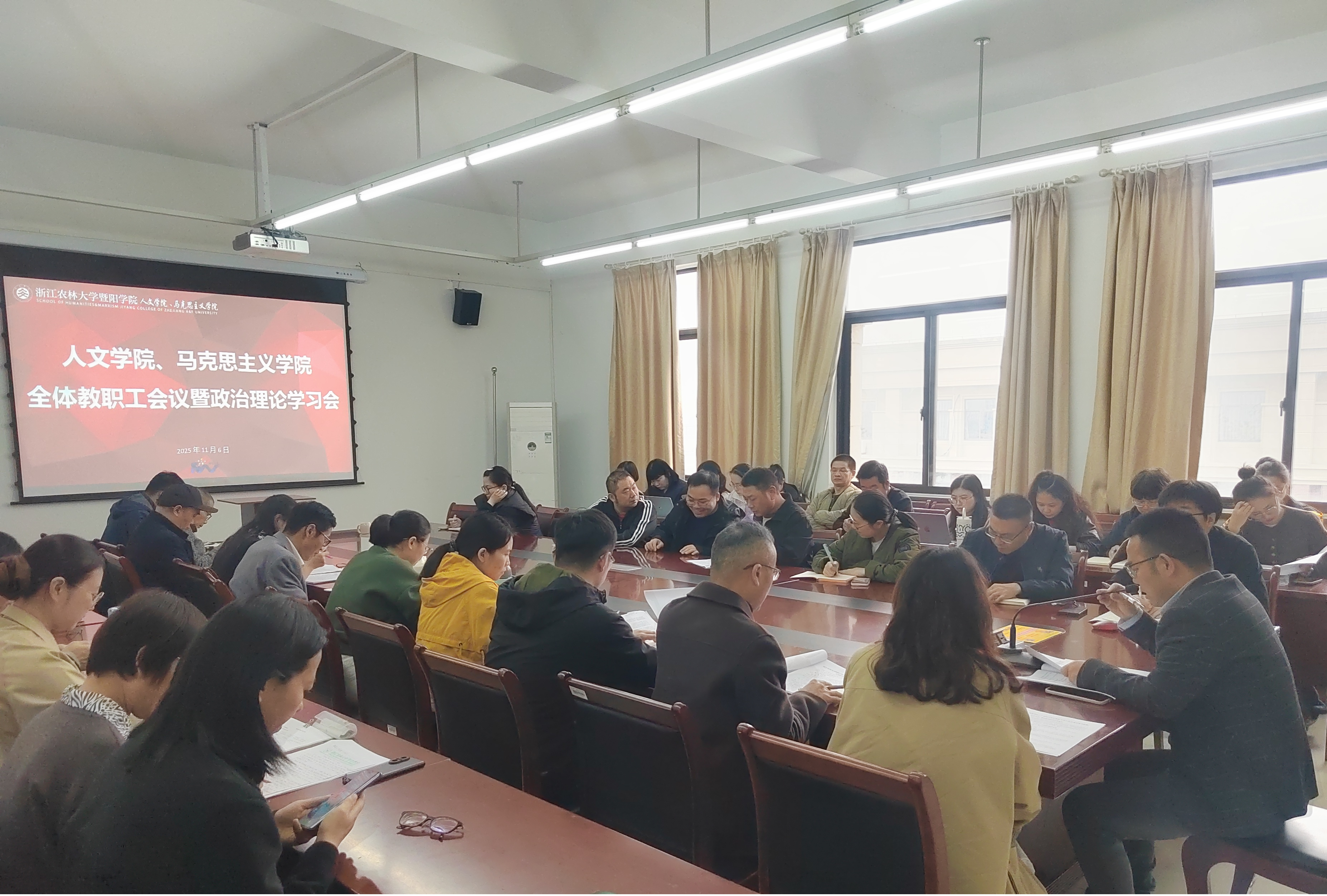 11月6日下午,人文学院、马克思主义学院在人文3502会议室召开2025年秋季学期全体教职工会议暨第十次政治理论学习会。学院党委委员、科研管理部主任杨洁,副主任龙春阳出席会议,对科研工作相关制度进行解读。人文学院、马克思主义学院党总支书记周聪、人文学院副院长(主持工作)汪永奇、人文学院、马克思主义学院党总支副书记石杭科、马克思主义学院副院长蓝强及全体教职工参加会议。会议由石杭科主持。