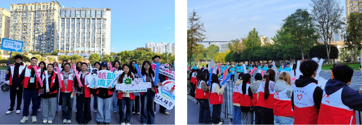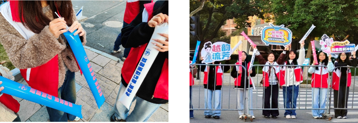 活动伊始,法学专业学生党支部志愿者提前抵达指定点位,在社区负责人的带领下分发“一起热爱,一起发光”“向着胜利冲刺”等特色标语牌并准备各色啦啦棒道具。赛前,志愿者们反复演练助威口号,确保以最佳状态服务赛事;比赛期间,每当运动员身影出现,志愿者们便高举标语、挥动啦啦棒,清脆的碰撞声与整齐的“加油”呐喊交织,形成强烈的视觉与听觉鼓励。面对体力不支的选手,他们更是加快啦啦棒的挥舞频率,用实际行动传达对运动员的鼓励,传递温暖与尊重,志愿者们以高昂的意志和热情的呐喊让每一位运动员感受到温暖与鼓舞。