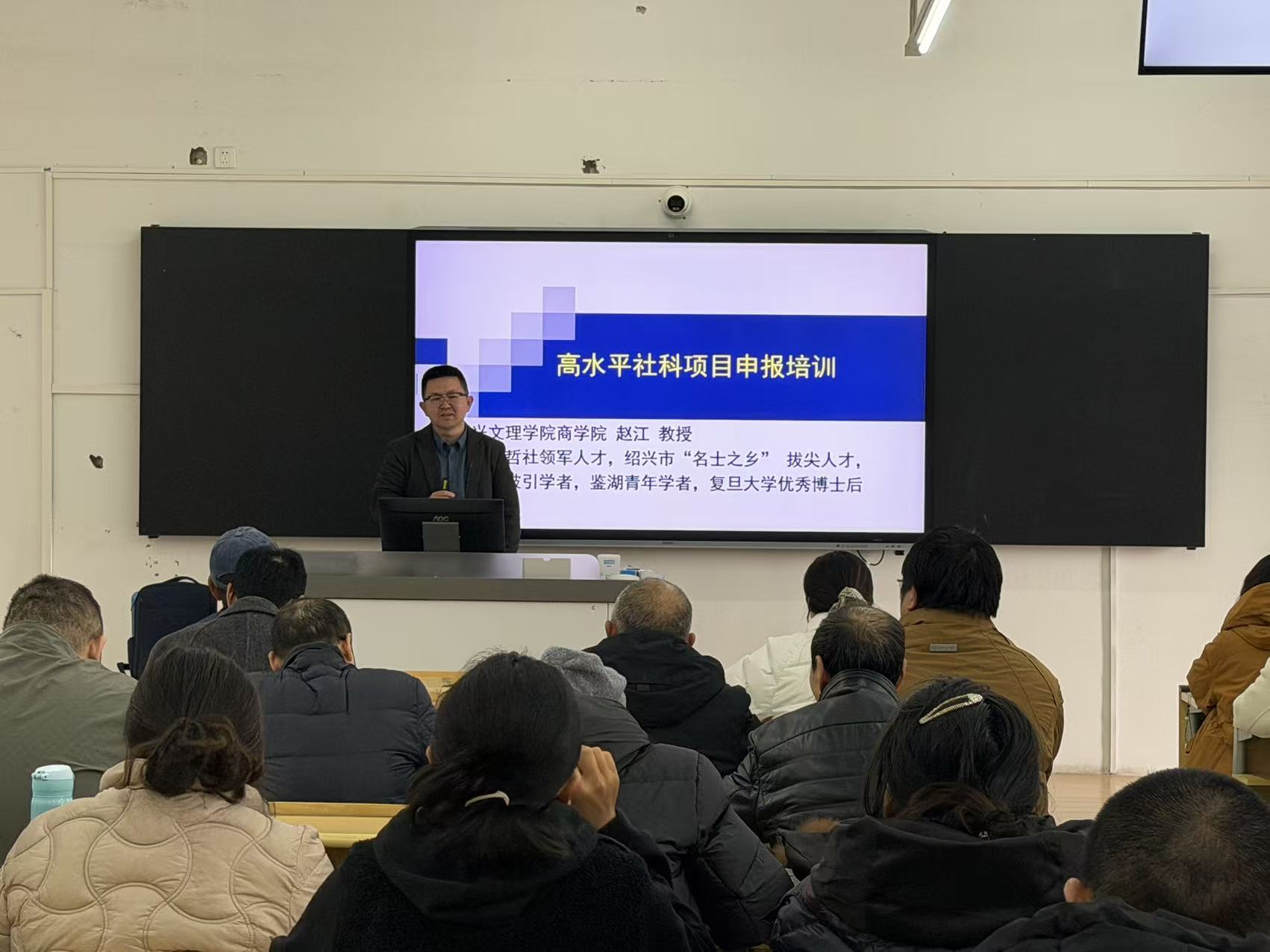 3月19日下午,人文学院、马克思主义学院举办名师大讲堂第十三讲,特邀绍兴大学教授赵江作题为《高水平社科项目申报培训》的专题讲座。讲座由人文学院副院长(主持工作)汪永奇主持,学院全体教师参加。