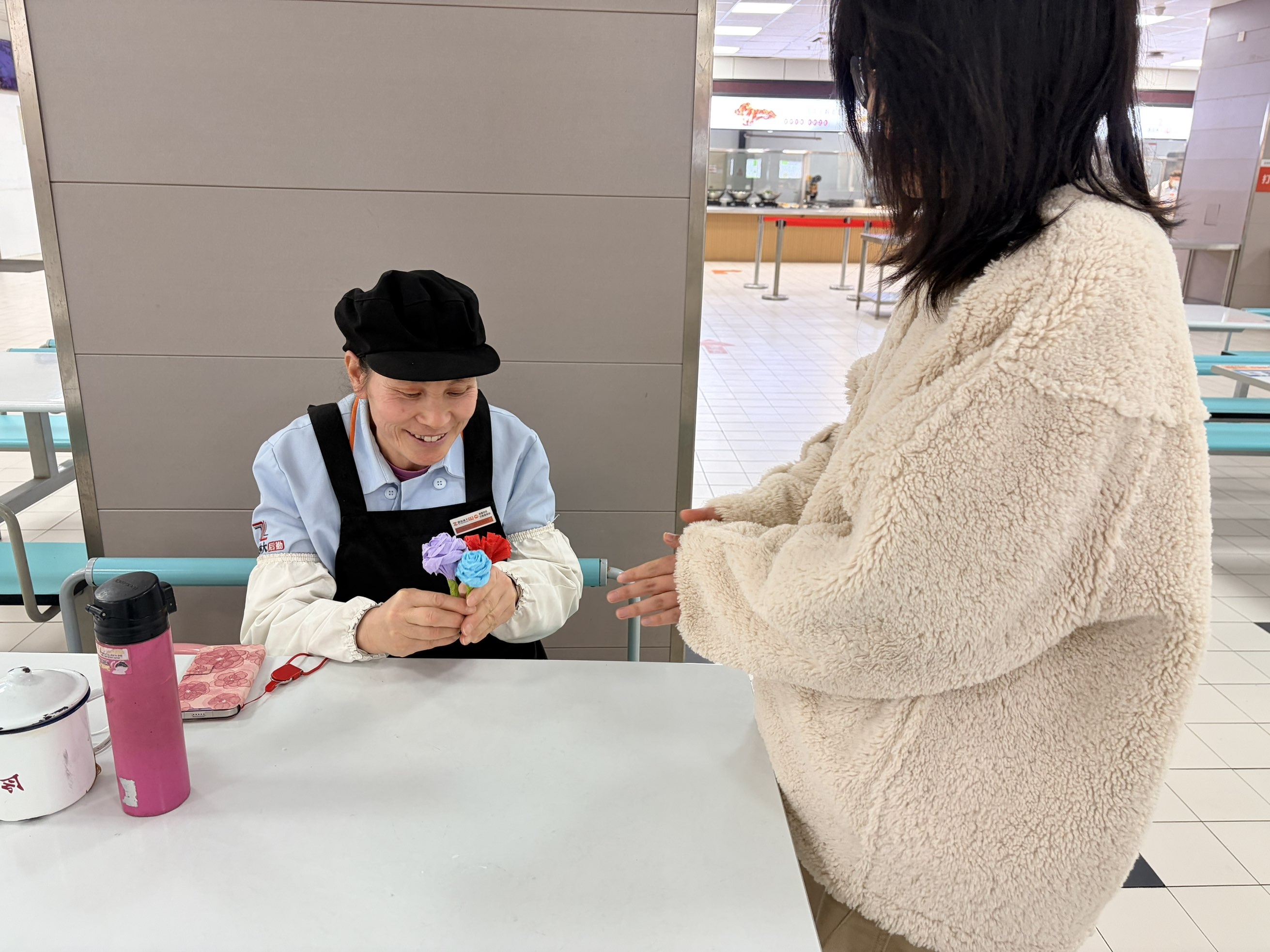 法学专业学生党支部开展了“巧手制花,致敬平凡”活动。成员们亲手制作皱纹纸手工花,并分组赠送给食堂阿姨、宿管老师和保安大叔。这一束束满载敬意的手工花,传递了对默默守护校园工作者的感谢。