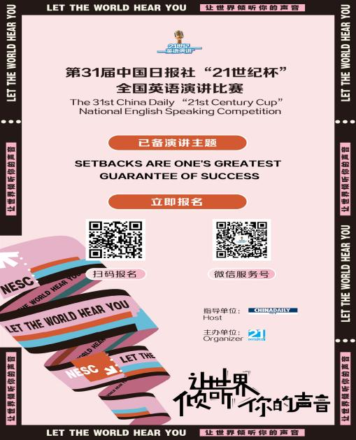 为推动大学生深入学习习近平新时代中国特色社会主义思想,贯彻落实党的二十大精神,为提高中国青年讲好中国故事的能力水平,为加强我国国际传播能力建设、促进文明交流互鉴、推动构建人类命运共同体凝聚青春力量,暨阳学院决定组织参加由中国日报社主办的“21世纪杯”全国英语演讲比赛。本次大赛分地区初赛、地区复赛、地区决赛、全国半决赛/总决赛四个阶段,现将相关事宜通知如下: