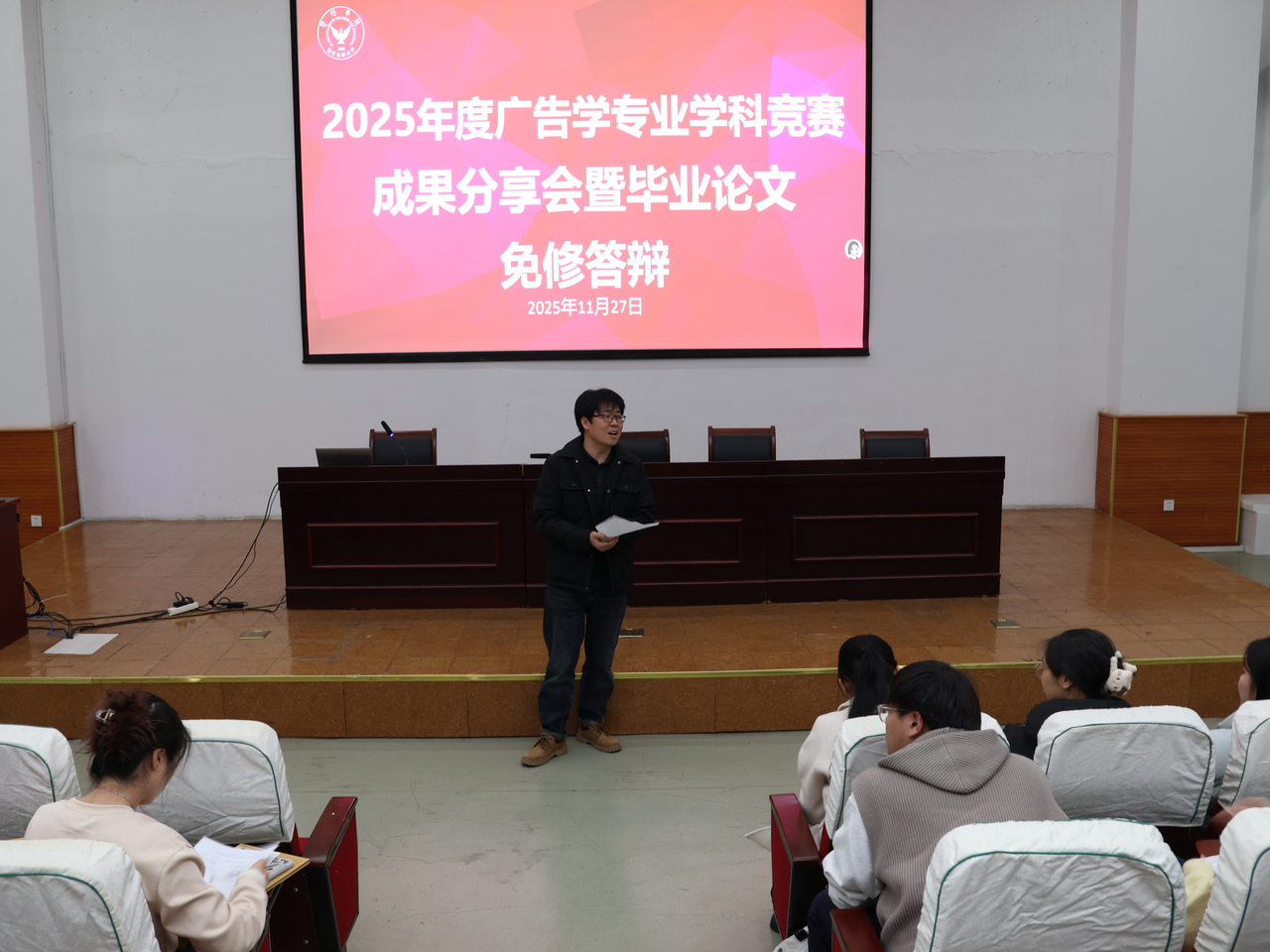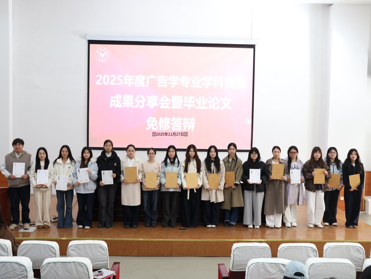 近日,浙江农林大学暨阳学院2025年度广告学、网络与新媒体专业学科竞赛成果分享会暨毕业论文免修答辩会圆满落幕。17位2026届毕业生因获得省级一等奖及以上奖项,取得毕业论文免修资格,并在现场分享了参赛实战经历与实习成长收获。